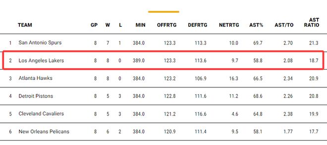 这支八连胜的湖人依靠是依靠进攻破局,湖人这八场比赛进攻效率123.3与马刺并列联盟第一,防守效率113.6联盟第八,但净效率9.7联盟第四。