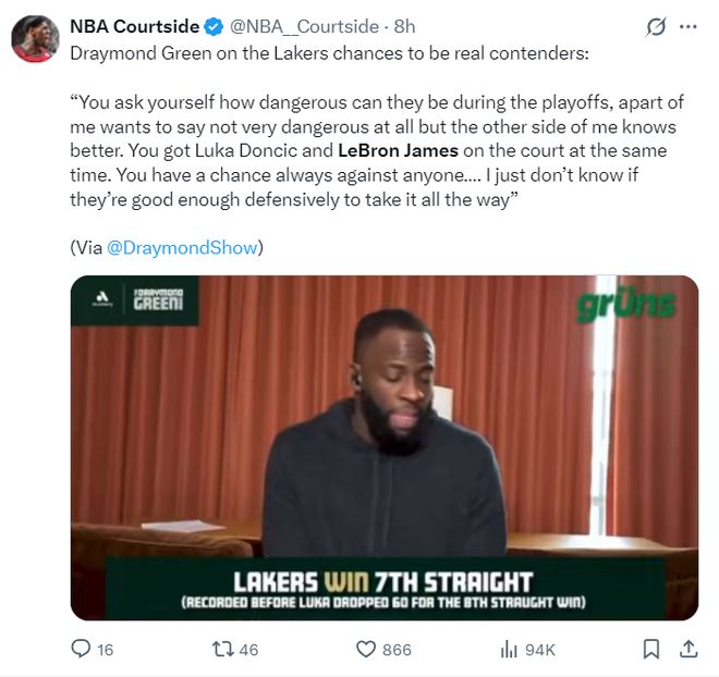 追梦格林在评价如今这支湖人时他的说法是东契奇、詹姆斯让湖人变得危险,他的原话是:你会问他们在季后赛能有多危险,一方面我会觉得他们可能没那么危险,但另一部分的我知道事情没那么简单。当东契奇和勒布朗同时在场上时,你对任何对手都始终有机会……”