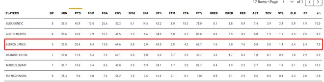 詹姆斯得分湖人第三,篮板湖人第二,助攻湖人第三,命中率湖人第二,三分命中率湖人第二,正负值湖人第四,很明显41岁勒布朗的贡献被大大低估了。