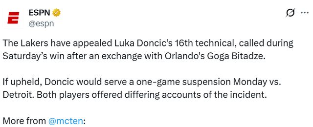 这是东契奇本赛季第16次技术犯规。如果这次技犯不予撤销,按照规则,他将因为技犯满16次,在下周二湖人对阵活塞的比赛中自动禁赛一场。