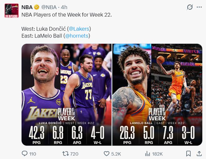 赛前东契奇成为西部周最佳,他上周场均42.3分6.3助攻带队4胜0负,实际上湖人一波九连胜期间东契奇场均也超过40分比肩张伯伦。