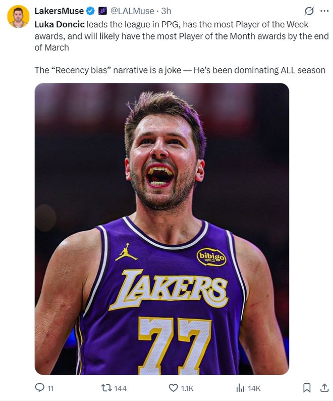 湖媒写道:东契奇得分榜领跑联盟,他获得周最佳球员最多,但三月底后他获得月最佳的次数也可能是最多的。“近因效应偏差”这种说法简直是个笑话,他整个赛季都处于主导地位。