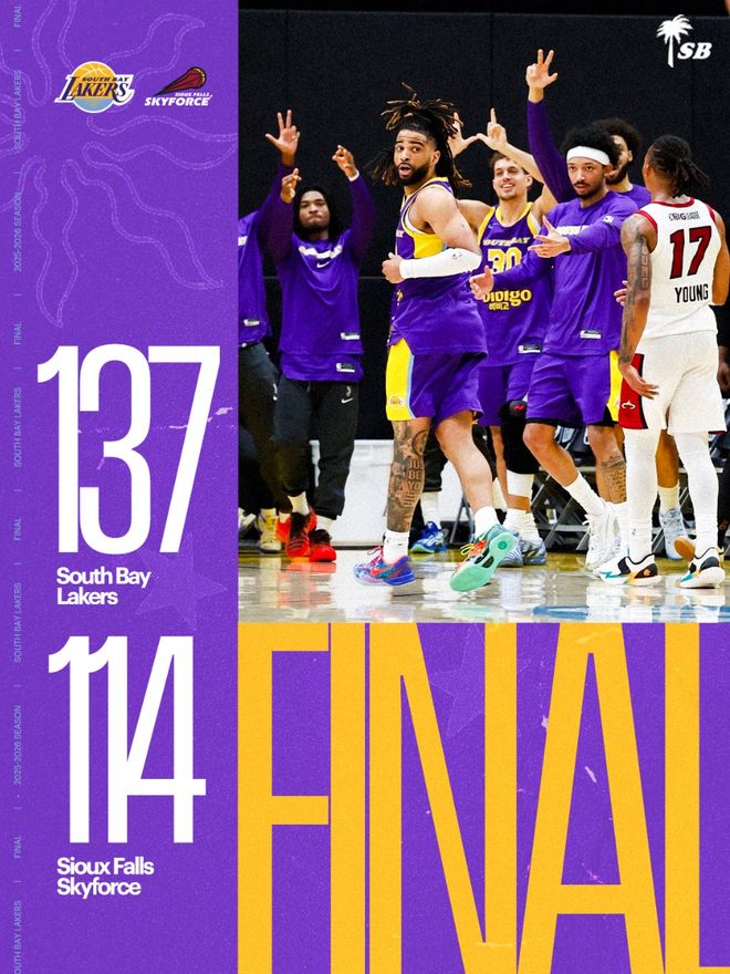 这场比赛南湾湖人137-114大胜苏福尔斯天空力量队,布朗尼帮助南湾湖人完成了一场酣畅淋漓的大胜。