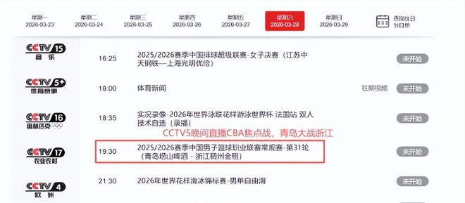 备受关注的赛事转播安排也同步出炉。中央电视台体育频道(CCTV5)正式官宣,将于当晚19:30黄金时段全程直播青岛男篮对阵浙江男篮的巅峰对决。