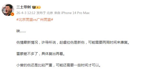北京时间4月3日,当赵睿在上一轮对阵浙江的赛前因伤临时退赛,如今根据北京主帅许利民透露,赵睿的拉伤是新伤,可能需要两周时间来康复,而曾凡博与雷蒙也还在康复过程中。
