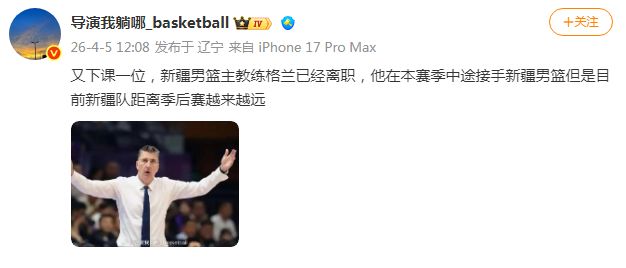 北京时间4月5日,在赛季初刘炜因为战绩不佳离队后,如今根据媒体人导演我躺哪报道,新疆男篮新任主教练格兰也已经离职。新疆男篮赛季未打完已经两人主帅离任,而球队只有倒数第四战绩距离季后赛越来越远。