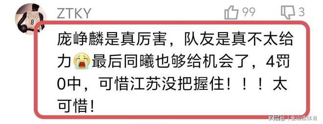 “老六”都爆成这样了,依然换不来一场胜广东,赛后网友纷纷表示。“庞峥麟是真厉害,队友是真不太给力。最后同曦也够给机会了,4罚0中,可惜江苏没把握住,太可惜!”;“江苏队除了老6和外援,其他人真的不知道有什么用!”;“江苏这群队友投三分编得离谱,连肌肉记忆都没有那种!我上我也行。”;“看江苏只用看老六贾尔斯和亨特三个人其他都是菜鸡没一个有用的”;“老六啊,这帮队友太不给力了,下赛季赶紧换个球队吧”……