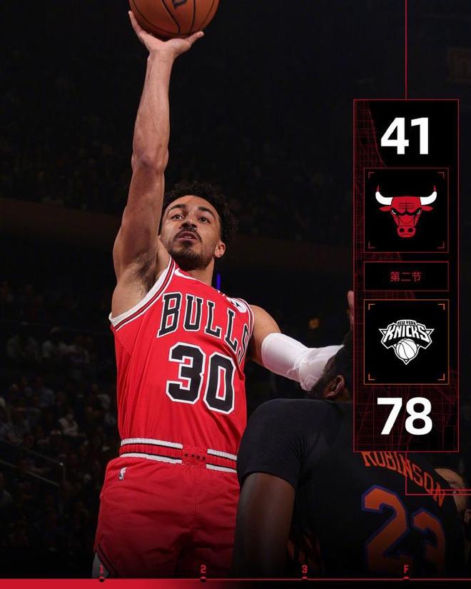 次节比赛,双方进攻火力均是有所提升,尤其是尼克斯单节狂轰40分。尼克斯继续一边倒碾压公牛,前两节比赛尼克斯三分23中10,阿奴诺比5记三分19+5+2与罗宾逊6中6得到15+10、布伦森9分9助攻。公牛三分22中7,塞克斯顿4记三分12分与吉迪6中0得到0分3篮板3助攻3失误。尼克斯单节40-25净胜15分,上半场结束尼克斯扩大78-41领先公牛37分巨大优势。