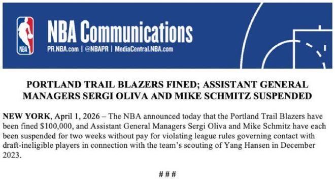 只是如今NBA官宣,开拓者因两年前与杨瀚森进行违规接触,从而被联盟重罚10万美元,而开拓者的两位总经理助理迈克-施密茨和塞尔吉-奥利瓦,也将被停职一段时间。
