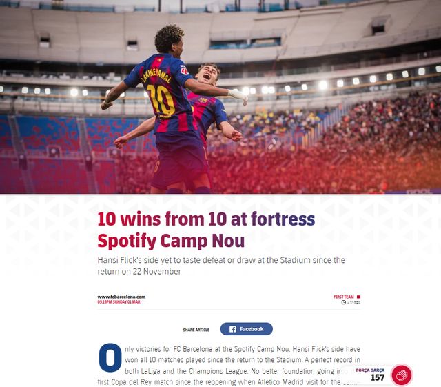 西甲第26轮,巴萨主场4-1横扫比利亚雷亚尔,继续保持主场全胜纪录。3月1日,巴萨官方盘点,回到新诺坎普球场之后,巴萨10战全胜,包括西甲8连胜、欧冠2胜。新诺坎普球场的4万球迷,是巴萨最坚实的后盾。