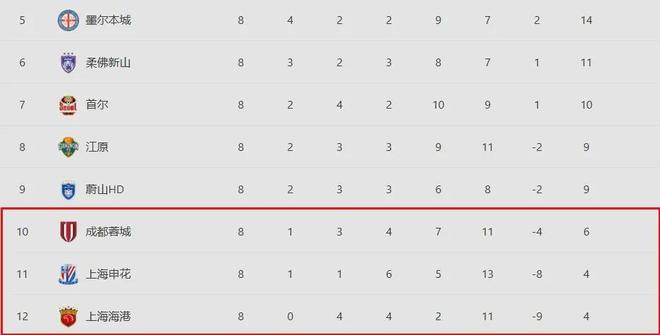 随着上海海港0-0逼平蔚山HD,亚冠精英联赛第8轮全部战罢。一个足以载入中国足球耻辱柱的数据赫然在目:代表中超出战的上海海港、上海申花、成都蓉城,在东亚区积分榜上包揽了倒数前三名。