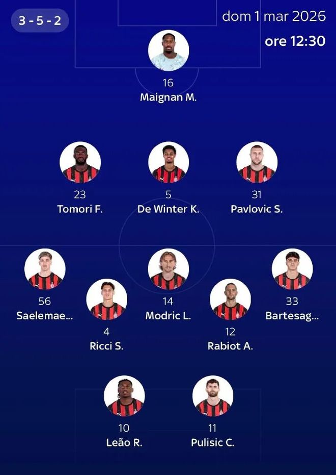 北京时间3月1日19点30分,意甲第27轮,米兰将在客场对阵克雷莫内塞。意大利天空体育给出了本场比赛米兰的预测首发阵容。