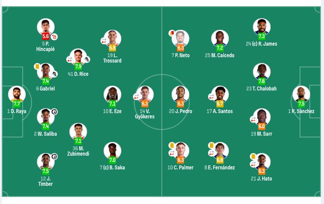 阿森纳首发:1-拉亚、12-廷伯、2-萨利巴、6-加布里埃尔、5-因卡皮耶、41-赖斯(76’16-诺尔高)、36-苏维门迪、10-埃泽、7-萨卡、19-特罗萨德(56’11-马丁内利)、14-约克雷斯(76’29-哈弗茨)。