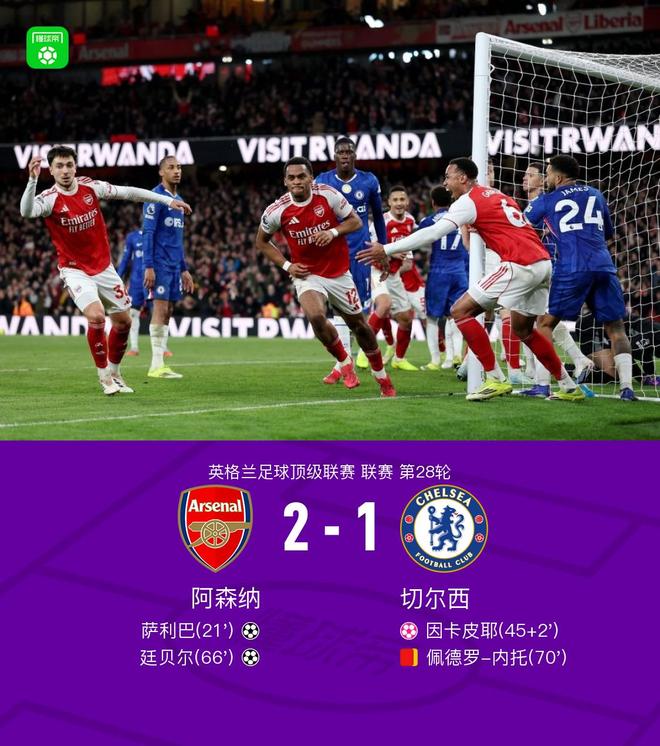 北京时间3月2日英格兰足球顶级联赛 联赛 第28轮,阿森纳主场对阵切尔西。阿森纳萨利巴破门,廷贝尔破门,因卡皮耶自摆乌龙。最终比分阿森纳 2-1 切尔西。