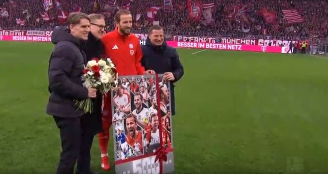 在客场对阵不莱梅一战,凯恩梅开二度,迎来了职业生涯500球里程碑。同时,凯恩22场德甲打入26球,打破了莱万保持的德甲同期进球纪录,凯恩也成为史上第一位前三个德甲赛季至少打入25球的球员。在对阵法兰克福之前,拜仁为凯恩送上了纪念品。