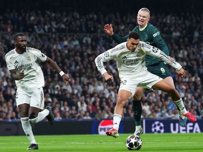 第68分钟萨维尼奥右路下底传中,吕迪格抢在后点包抄的哈兰德之前,将皮球解围力保球门不失,7分钟之后,皇马小将皮塔奇禁区内犯错,给了奥赖利直接起脚的机会,好在库尔图瓦神扑救主力保球门不失,让皇马在主场成功零封了蓝月军团。