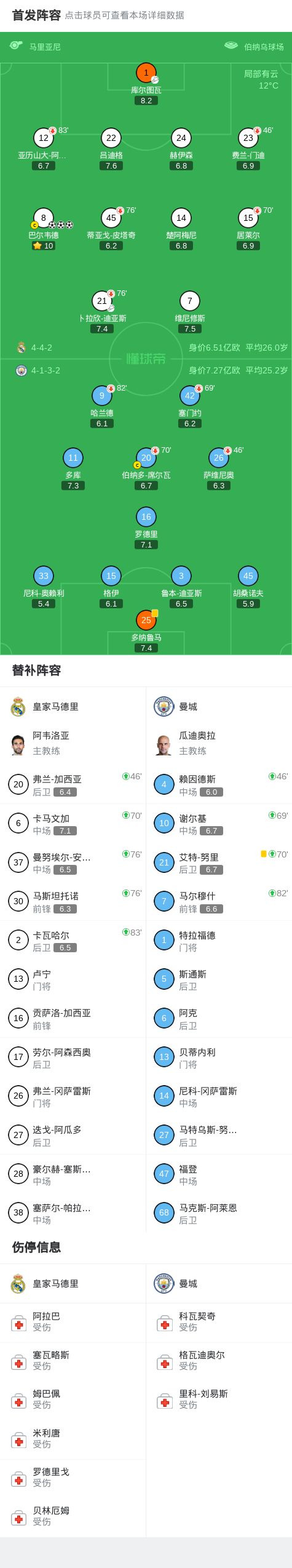 北京时间3月12日欧洲冠军联赛 1/8决赛首回合,皇家马德里对阵曼城。皇家马德里巴尔韦德帽子戏法。最终比分皇马 3-0 曼城。