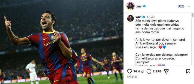 这位巴萨传奇在帖文开头还引用了巴萨队歌中的一句歌词:“Són molts anys plens d'afanys, son molts gols que hem cridat i s'ha demostrar que mai ningú no ens podrà tòrcer。”(意为:这是许多年充满拼搏的岁月,这是无数次我们高声呐喊的进球,也早已证明,没有人能够让我们屈服。)