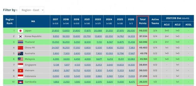随着柴桢晋级亚洲挑战者联赛半决赛,中超本赛季亚冠技术积分已经被柬埔寨联赛超越,仅排名东亚第10名。