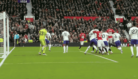 第53分钟,B费开出角球,在3名维拉球员的夹击下,卡塞米罗抢到前点,头槌破门。