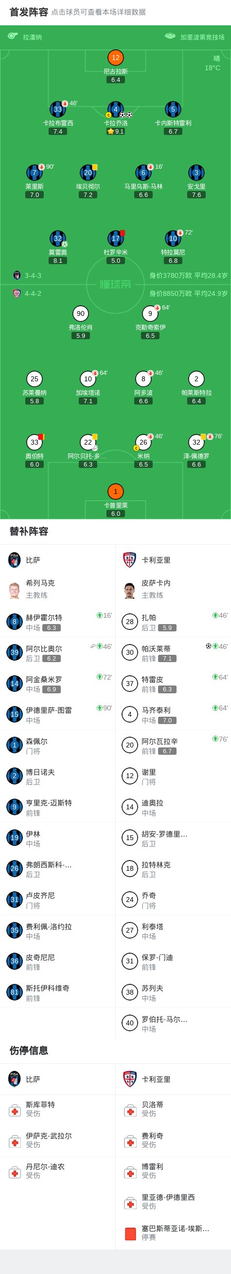比萨3-1卡利亚里,卡拉乔洛梅开二度,莫雷奥点射破门