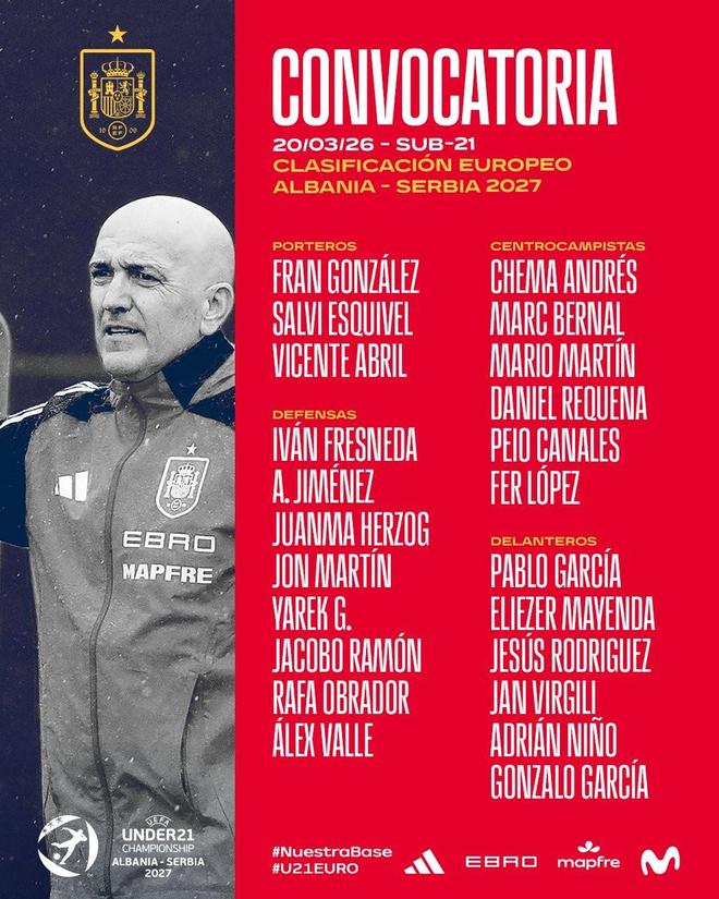北京时间3月20日,西班牙U21国青队公布了新一期大名单,巴塞罗那中场马克-贝尔纳尔和皇家马德里前锋贡萨洛-加西亚入选。