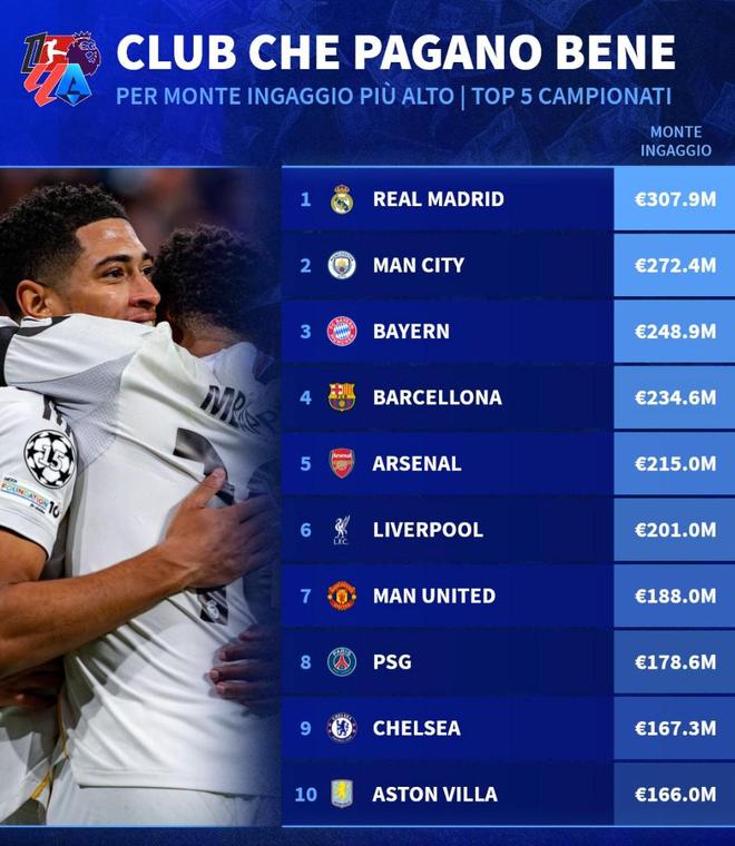 本赛季五大联赛球队工资TOP20:皇马超3亿欧第1,曼城第2