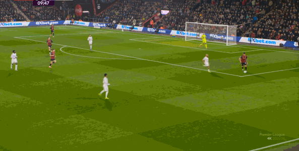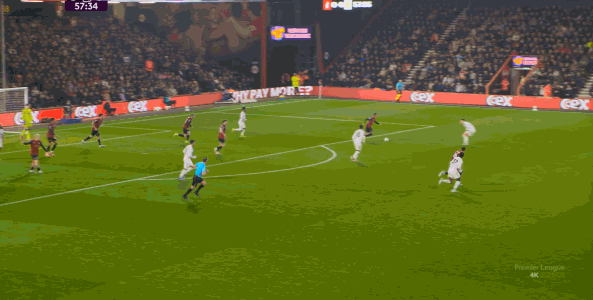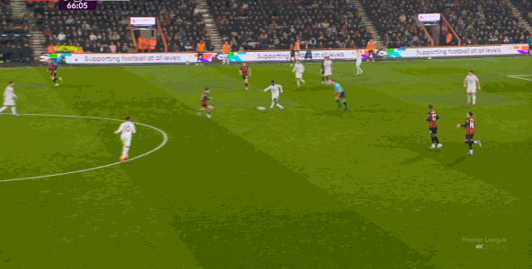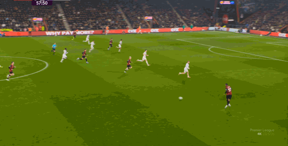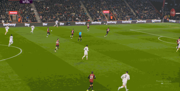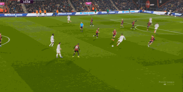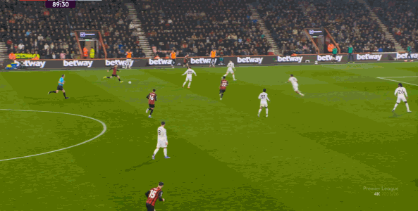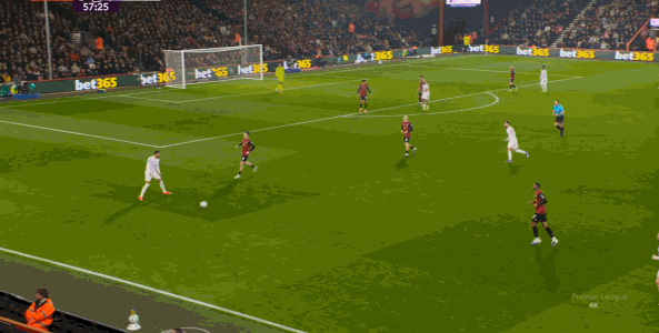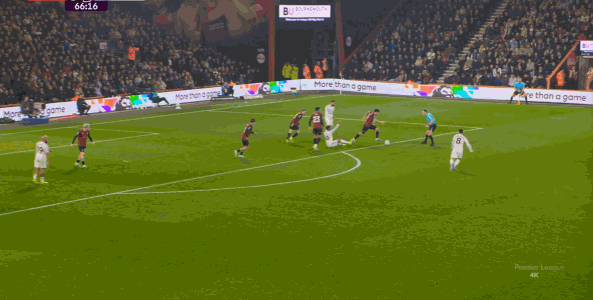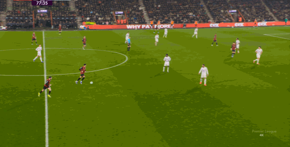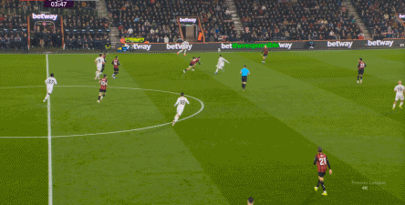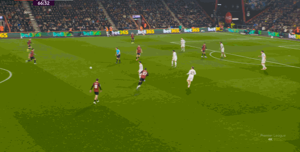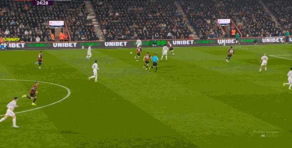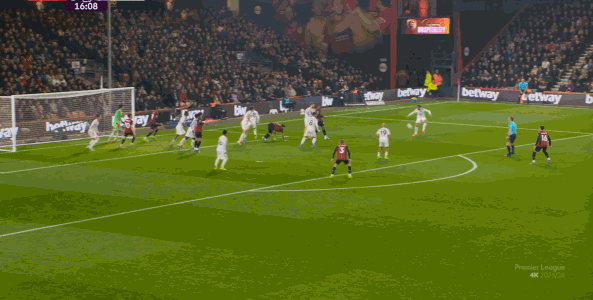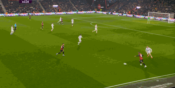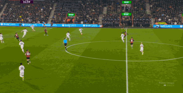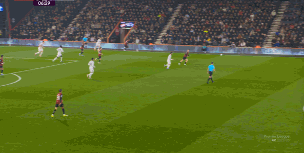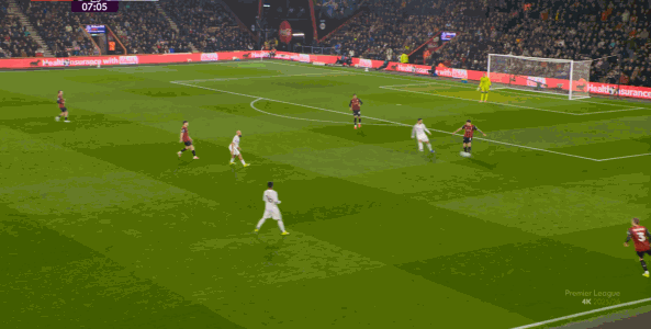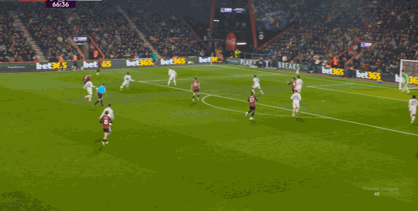 于是在这次转换中,伯恩茅斯击穿曼联的中路,随后从左路送上传中: