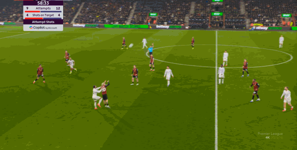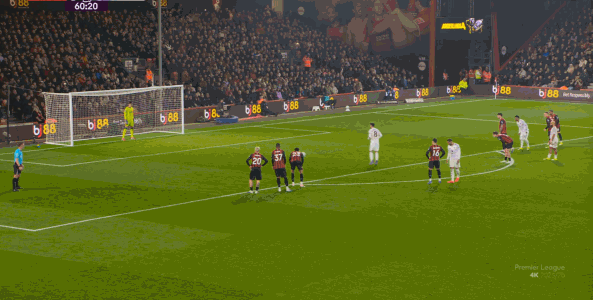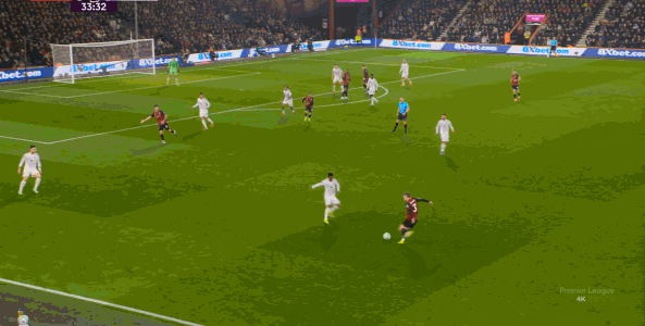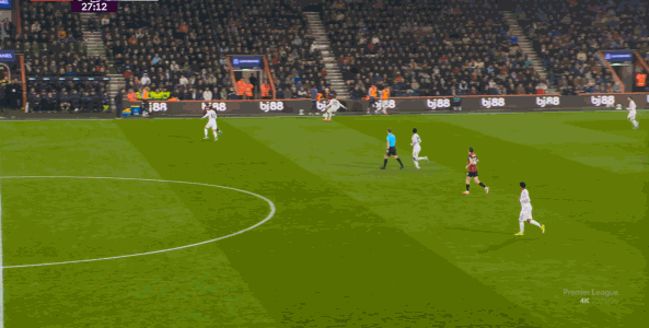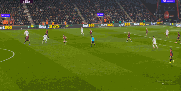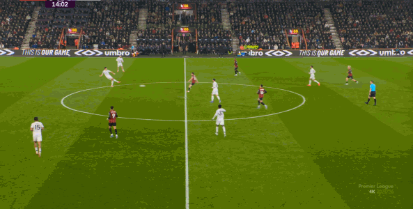 但整体来说,曼联还是占据了上风,并且形成了左右两路的优势局面,反观伯恩茅斯,在主场这个优势面前,只在22分钟前后打出了一波进攻,分别捕捉了布鲁诺和达洛特的失误,其余大部分时候都难有作为: