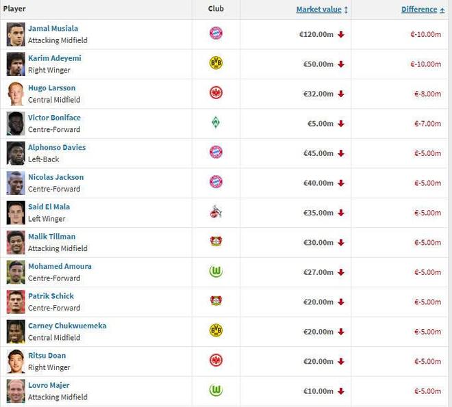 德甲球员身价跌幅榜:穆西亚拉、阿德耶米1000万欧居首