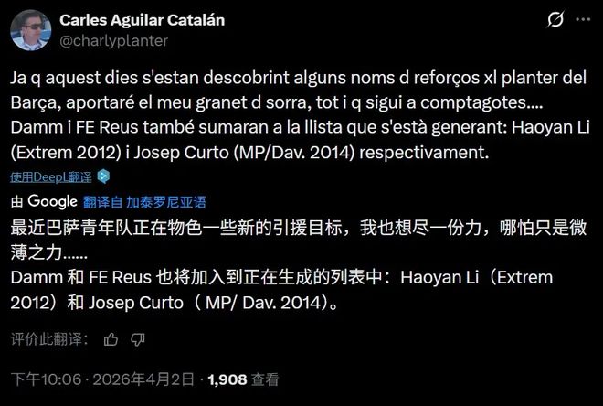 由于该记者相当于巴萨青训的“罗马诺”,他的消息无疑具有相当高的可信度。不出意外,李昊炎将成为中国“拉玛西亚”第1人。