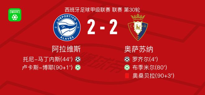 北京时间4月6日西班牙足球甲级联赛 联赛 第30轮,阿拉维斯主场对阵奥萨苏纳。阿拉维斯托尼-马丁内斯破门,卢卡斯-博耶破门。奥萨苏纳罗齐尔破门,布季米尔破门。最终比分阿拉维斯 2-2 奥萨苏纳。
