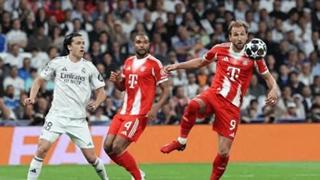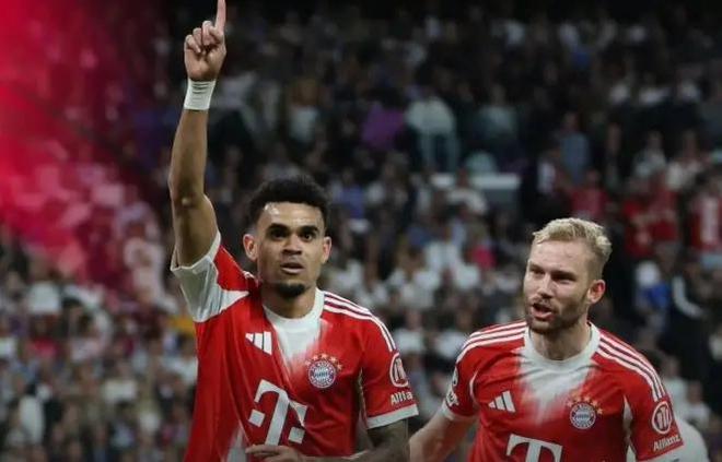 另一边的伯纳乌,剧本更刺激。第41分钟,皇马后场玩火,格纳布里断球直塞,迪亚斯单刀赴会,1-0!下半场刚开始不到30秒,皇马中场又送礼,奥利塞横传,凯恩在弧顶处不讲理爆射,皮球像炮弹一样钻入死角,2-0!这是凯恩生涯第一次在欧冠禁区外进球,含金量拉满。