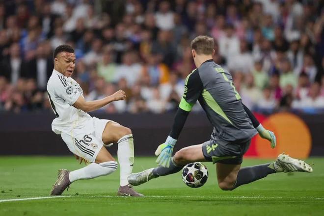 第18分钟,维尼修斯标志性左路内切、右脚兜射,诺伊尔迅速下地将球扑出;第29分钟,姆巴佩推射近角,诺伊尔完美预判封堵成功;第65分钟,姆巴佩禁区劲射,诺伊尔再度将必进之球拒之门外。据数据统计,诺伊尔本场阻止了1.05个预期进球——这意味着在正常情况下,皇马本应多进至少一球。